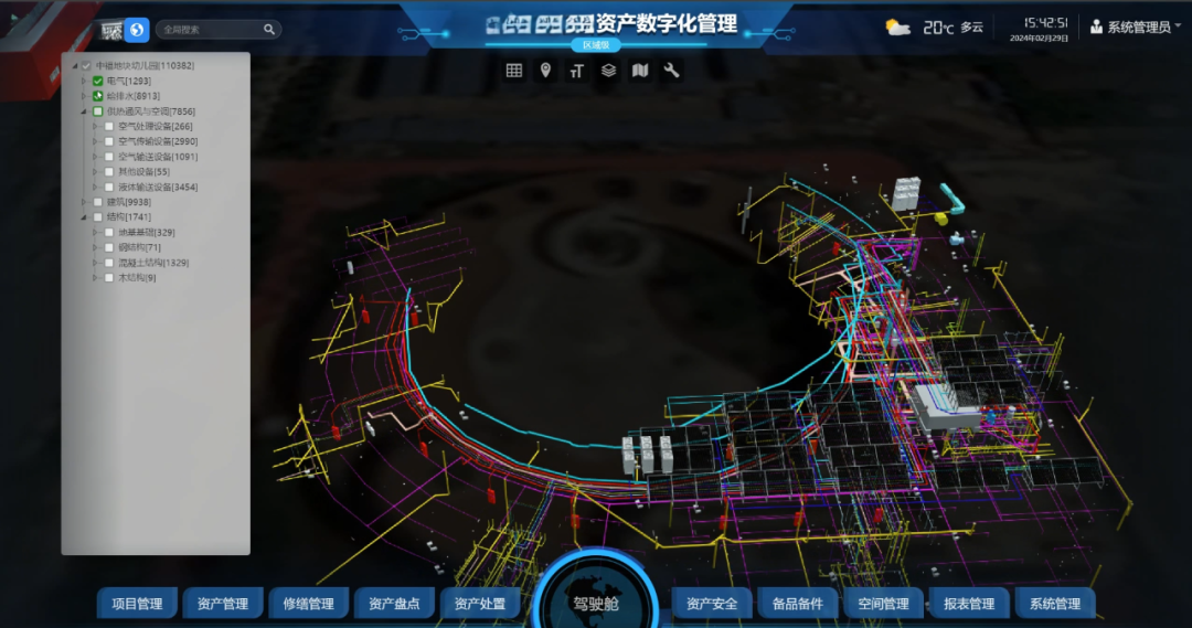 二者深度融合,彻底打破“图纸与现场脱节”“数据与空间割裂”的传统壁垒,让每一处资产都拥有可追溯、可交互、可分析的“数字生命体”。管理者轻点屏幕,即可从城市俯瞰视角逐级穿透至建筑内部的一台空调机组,实现从“万里河山”到“方寸零件”的无缝洞察。